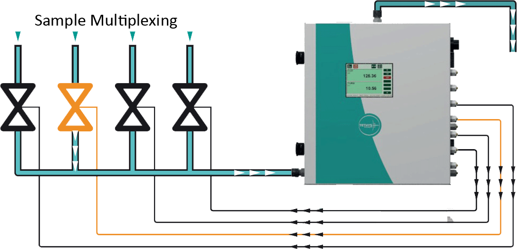 The measuring channels can be either duplicated (each one having its own 4-20mA output or MODBUS register), or measured sequentially to fit with the maximum of 16 measuring channels (a MODBUS register indicates which stream is currently being measured).
