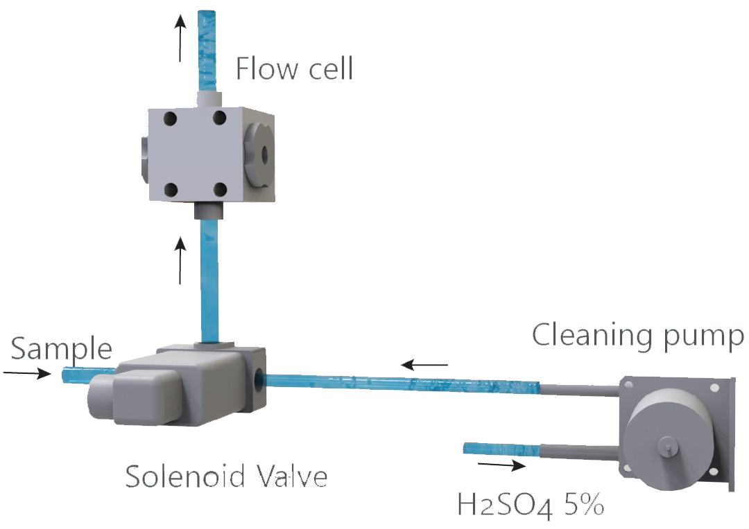 - The patented flow cell allows very high level of suspended solid without clogging. The turbidity is automatically compensated by a dual-wavelength method.