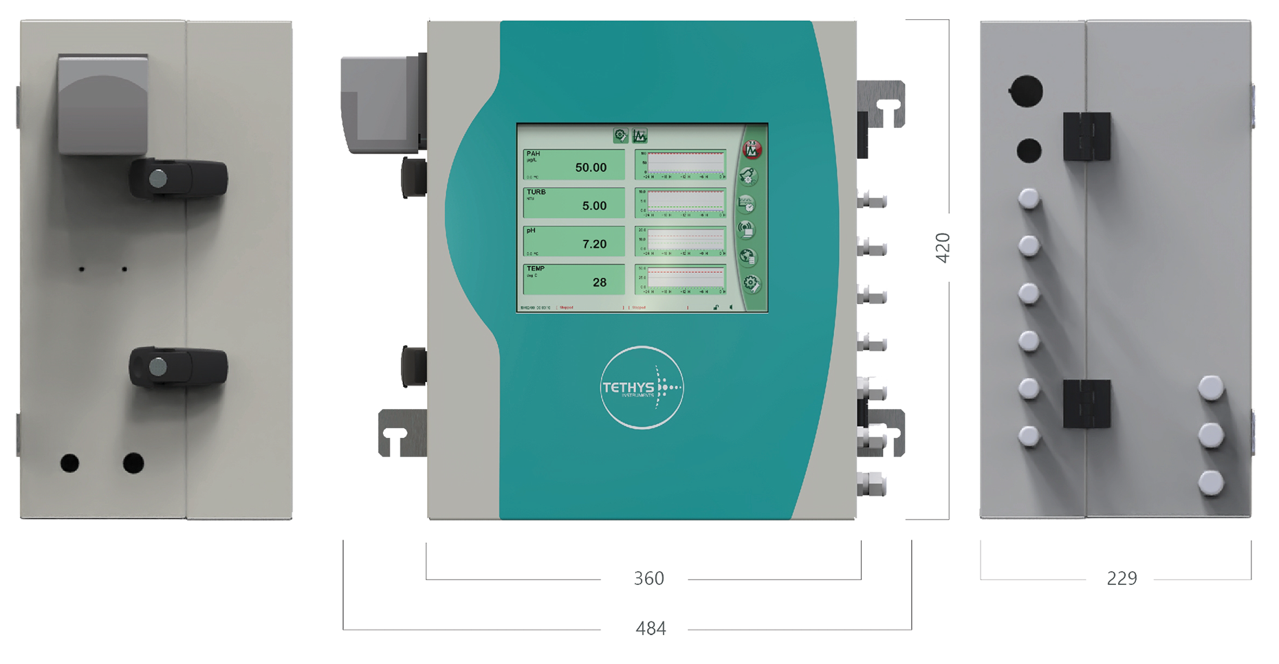 | UV500 IMO | PAH (Poly-aromatic Hydrocarbons) Range : 0 – 1000 πg/L phenanthrene Turbidity: Internal turbidity sensor Low range: 0 – 100 NTU, High range: 0 – 1000 NTU pH: 0 – 14 Temperature: 0 – 80 oC Color graphic display 640×480 pixels with touch screen Build-in data logger, memory 5000 measurements for each parameter 12 sockets for input and output modules (not including, refer to options) 7 available glands for inputs / outputs RS232 including (Sub-D 9 ways female connector) with 2 meters cable for PC USB port integrated for USB key connection Automatic cleaning system with 2 – litres tank Power supply 90-260 VAC 47-63 Hz with power cord 2 meters Enclosure IP65/Nema3 360×420×229 mm (WHD) / 20 to 30 kg Mounting lugs for wall |